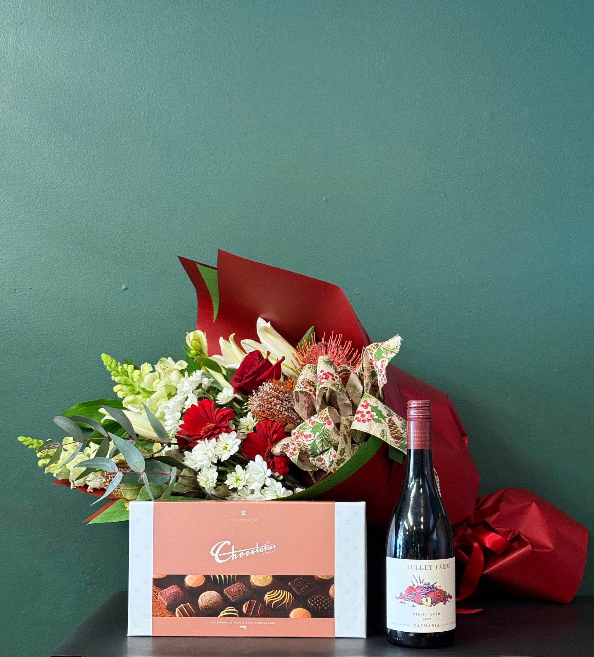 A joyful mix of seasonal reds, whites, and lush greenery, beautifully arranged in a festive box. Featuring Christmas favourites like roses, carnations, lilies, and fresh foliage, this bunch will bring the warmth and spirit of the season to any home.